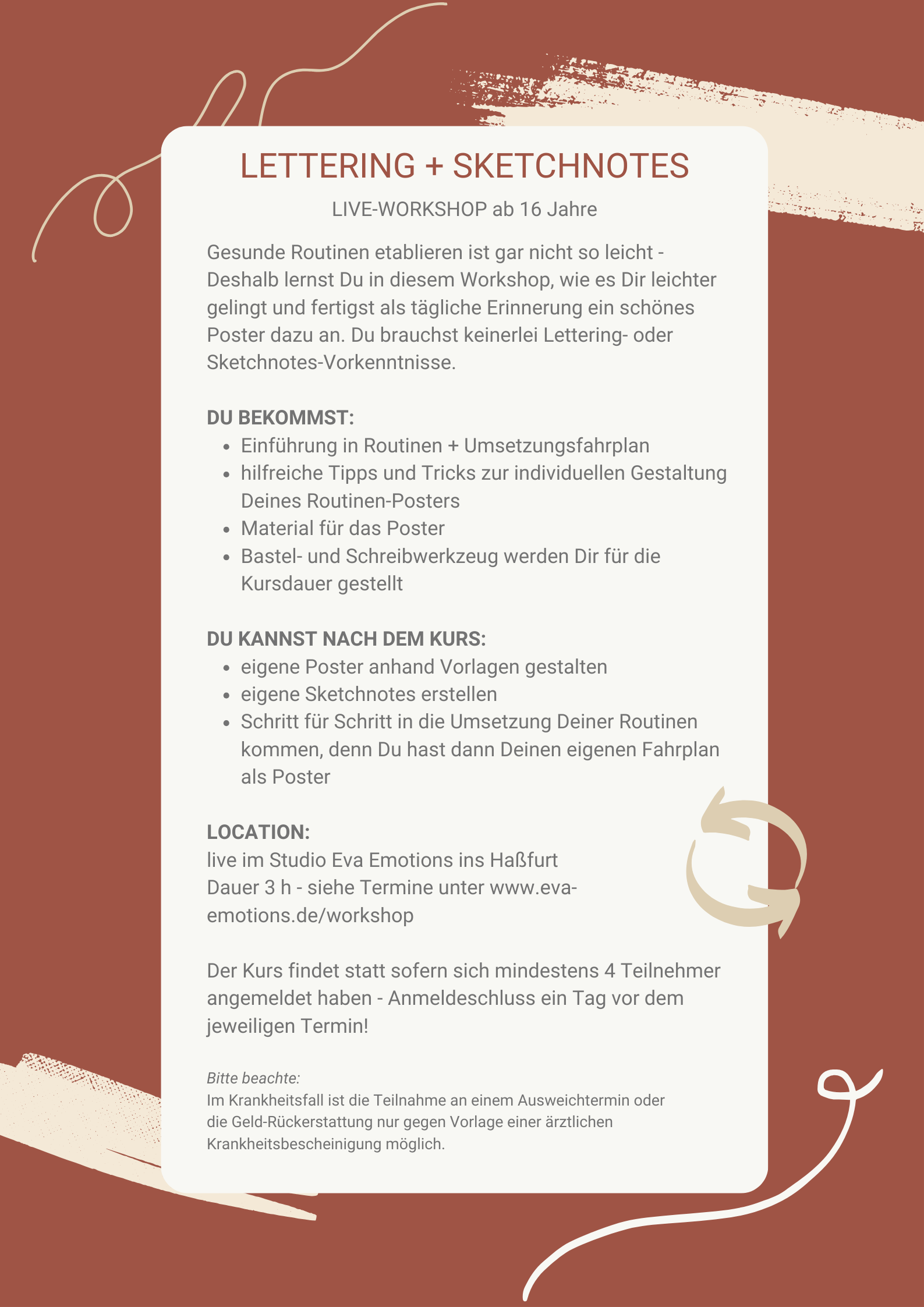 Gesunde Routinen etablieren ist gar nicht so leicht - deshalb lernst Du in diesem Workshop, wie es Dir leichter gelingt und fertigst als tägliche Erinnerung ein schönes Poster dazu an. Du brauchst keinerlei Lettering- oder Sketchnotes-Vorkenntnisse.
